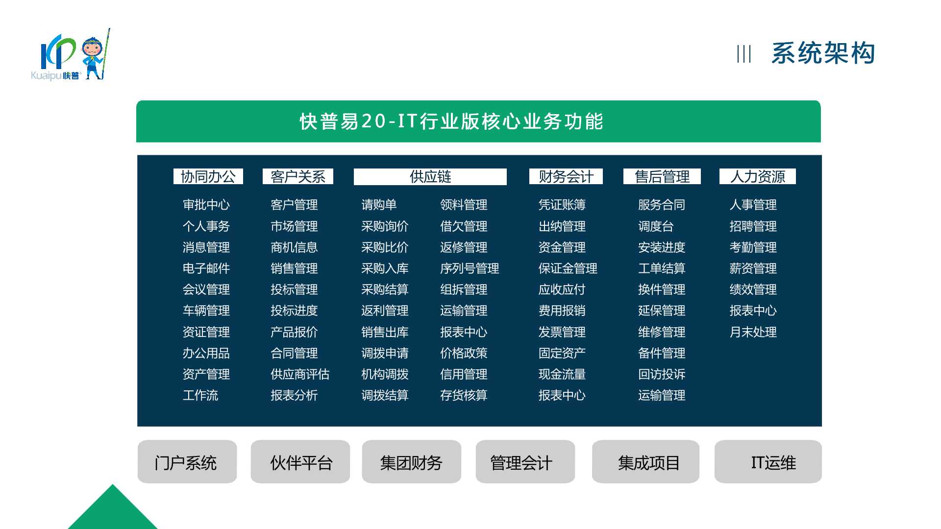 快普易20(IT行業(yè)版)為IT行業(yè)提供一站式、全流程、業(yè)財一體的數(shù)字化管理平臺,解決企業(yè)的資金、客戶、銷售、服務(wù)等管理難題,通過數(shù)字化轉(zhuǎn)型提升盈利能力!