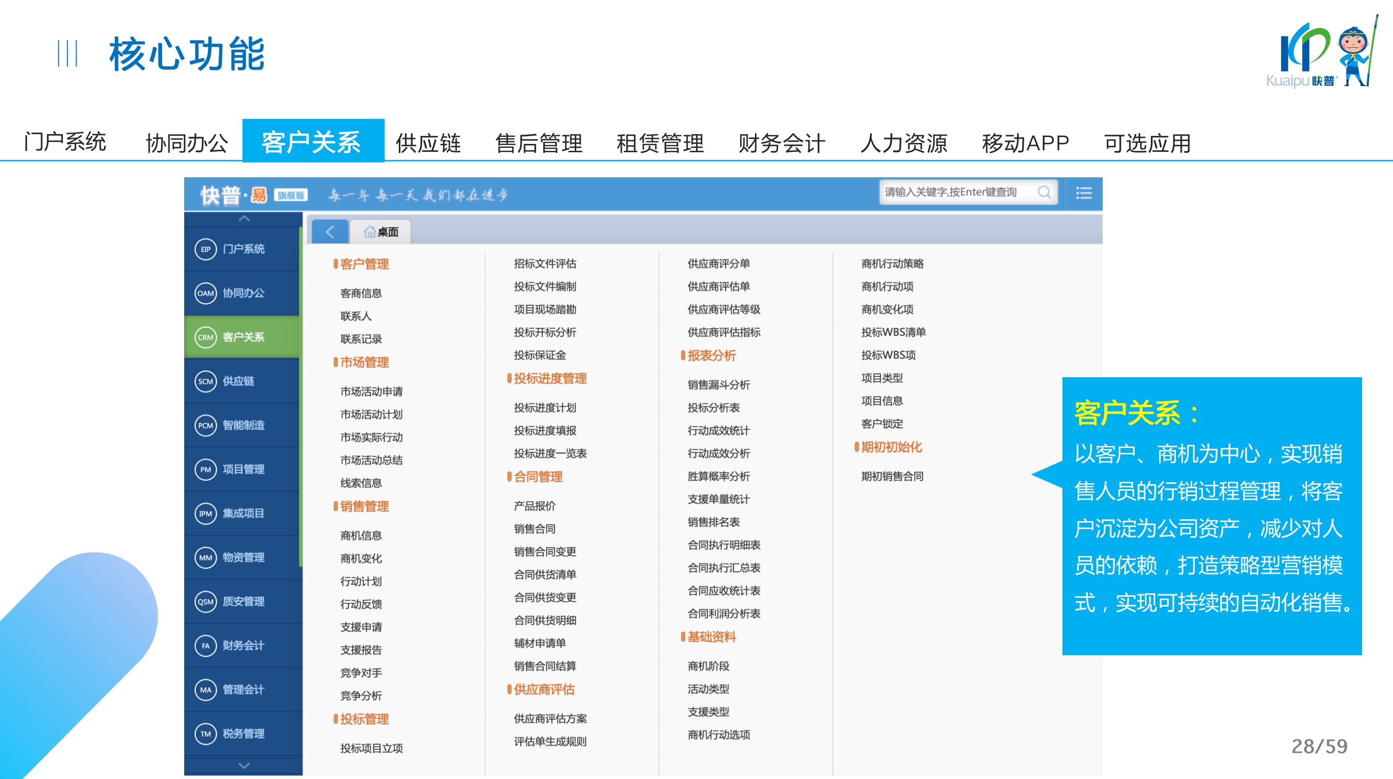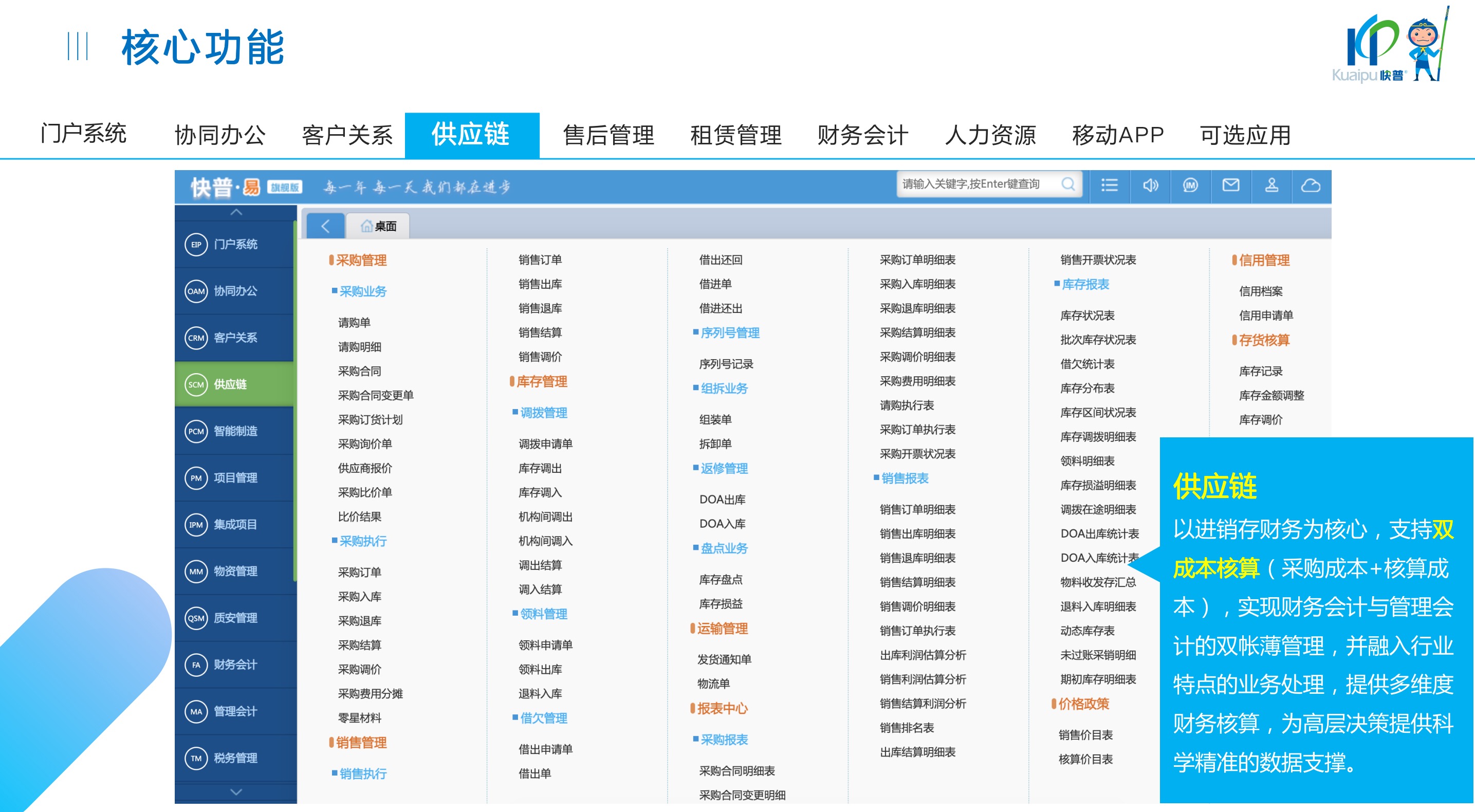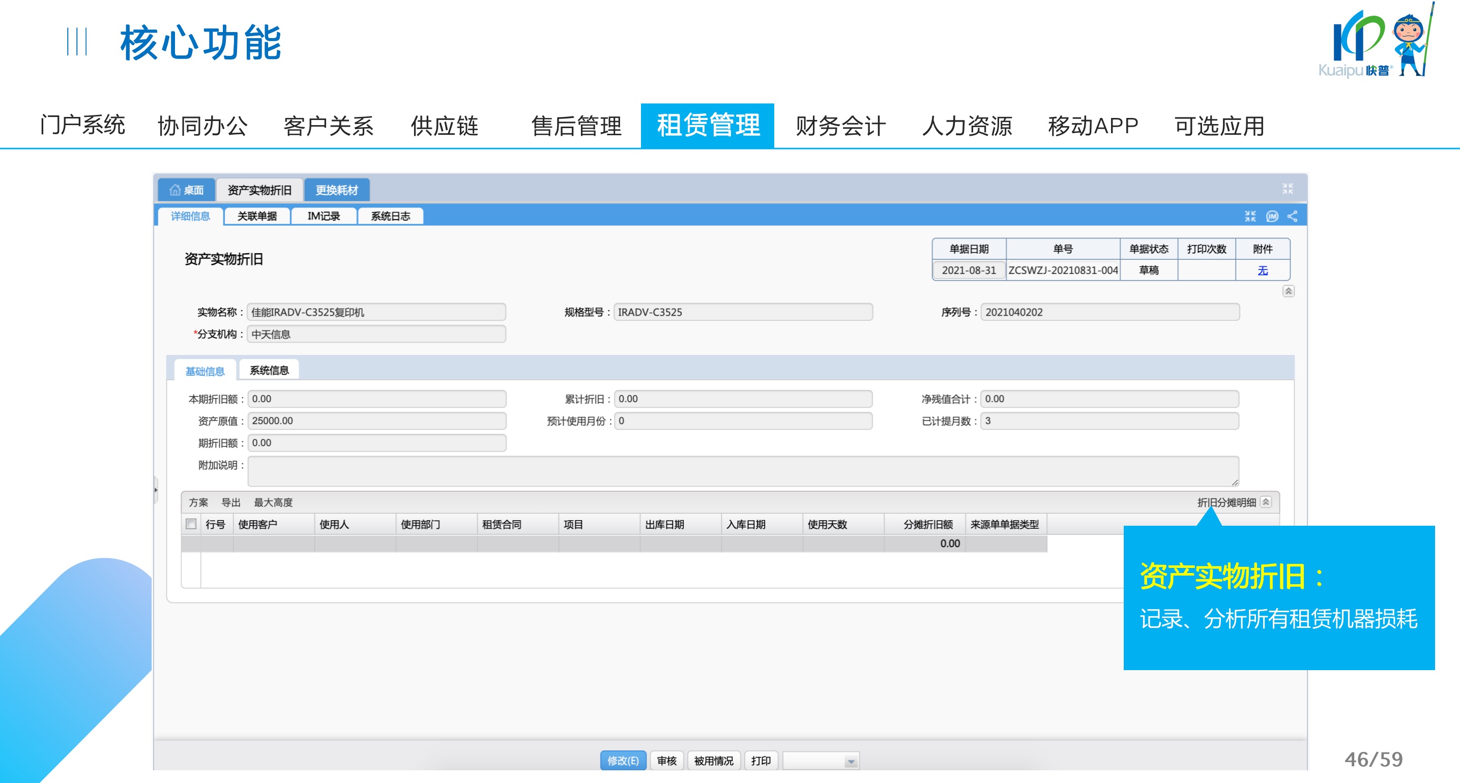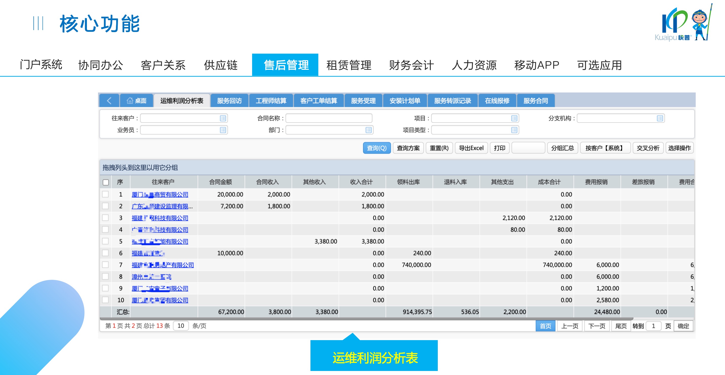 快普易30基于快普近20年在全國上萬家OA企業(yè)的實(shí)施與服務(wù)經(jīng)驗(yàn),融合了行業(yè)成功的管理智慧,以“客戶+機(jī)器”為中心提供數(shù)字化轉(zhuǎn)型解決方案,全面解決銷售、服務(wù)、租賃等多種業(yè)務(wù)模式的管理需求,以及企業(yè)經(jīng)營核算分析。