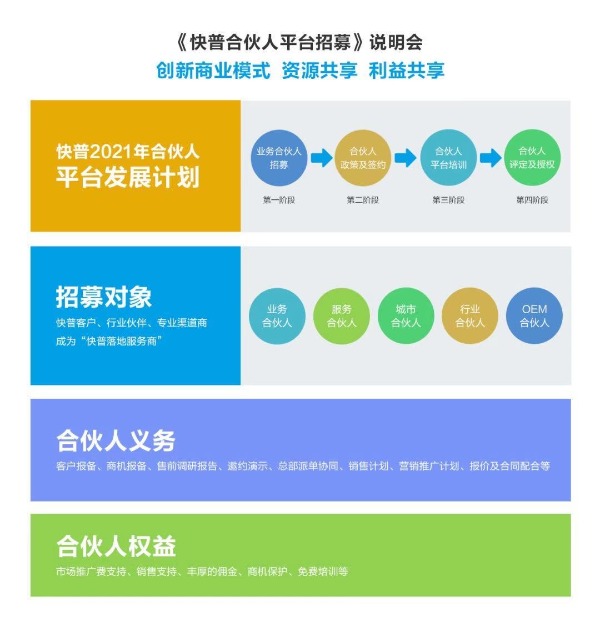 快普合伙人平臺(tái)將依托快普整合管理、專注細(xì)分行業(yè)與強(qiáng)大的技術(shù)平臺(tái)支持三大優(yōu)勢(shì),面向各行各業(yè)招募合伙人,通過(guò)多種合作形式,建立“快普落地服務(wù)商”,幫助全國(guó)更多企業(yè)實(shí)現(xiàn)信息化轉(zhuǎn)型,提高企業(yè)的技術(shù)創(chuàng)新能力與品牌價(jià)值。