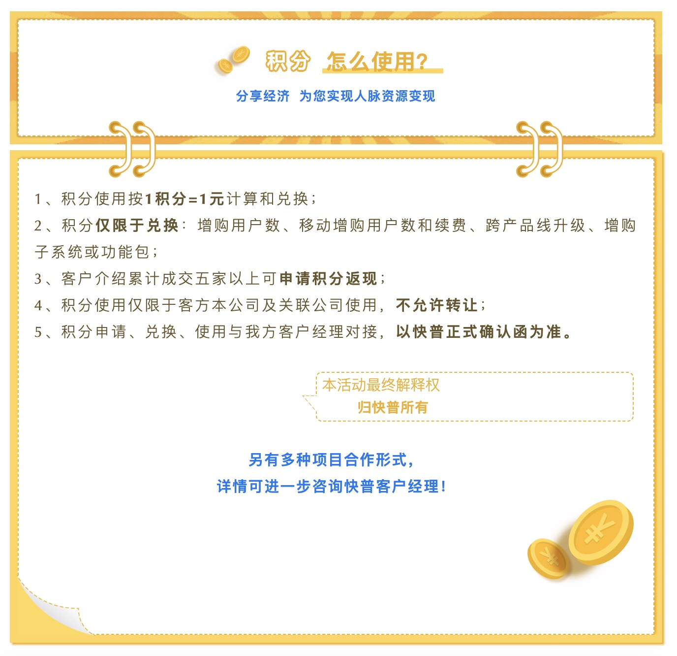 為進(jìn)一步回饋老用戶的貢獻(xiàn),現(xiàn)誠(chéng)邀您參與“快普感恩回饋大行動(dòng)!”,與我們共享數(shù)字經(jīng)濟(jì)發(fā)展的紅利!通過主動(dòng)推薦、轉(zhuǎn)介紹客戶,您將獲取豐厚的積分返利,讓您的每一份付出都得到實(shí)質(zhì)性的回報(bào),人脈資源也可以獲得變現(xiàn)!