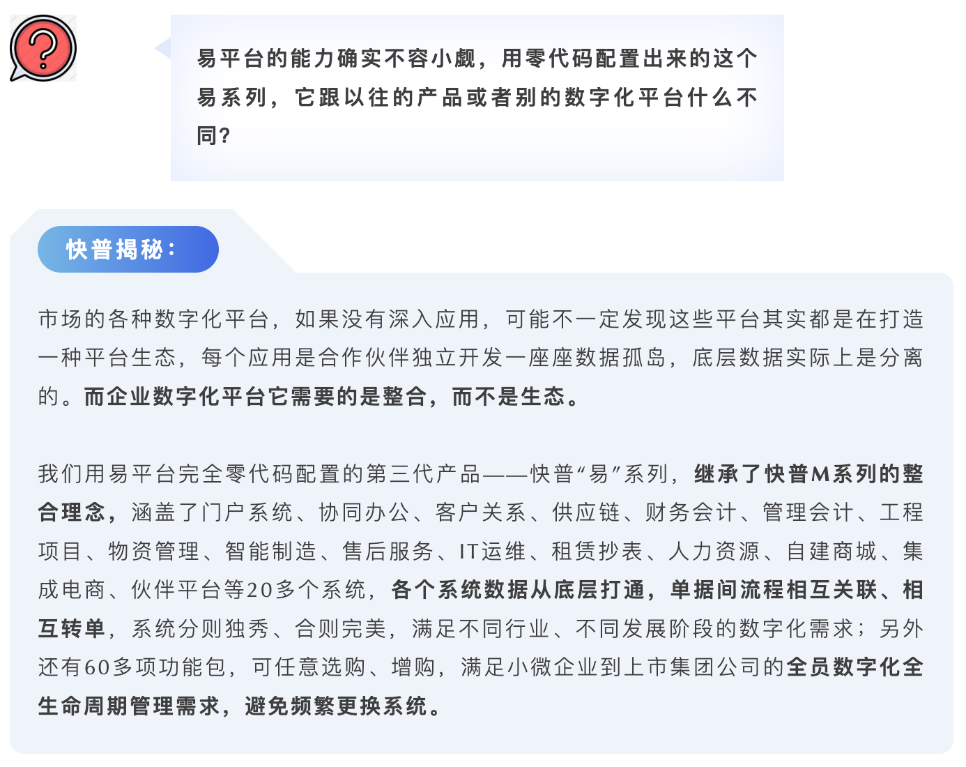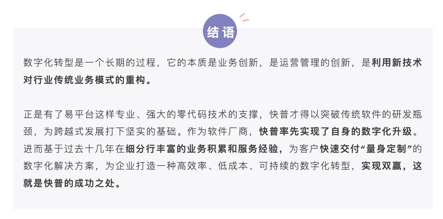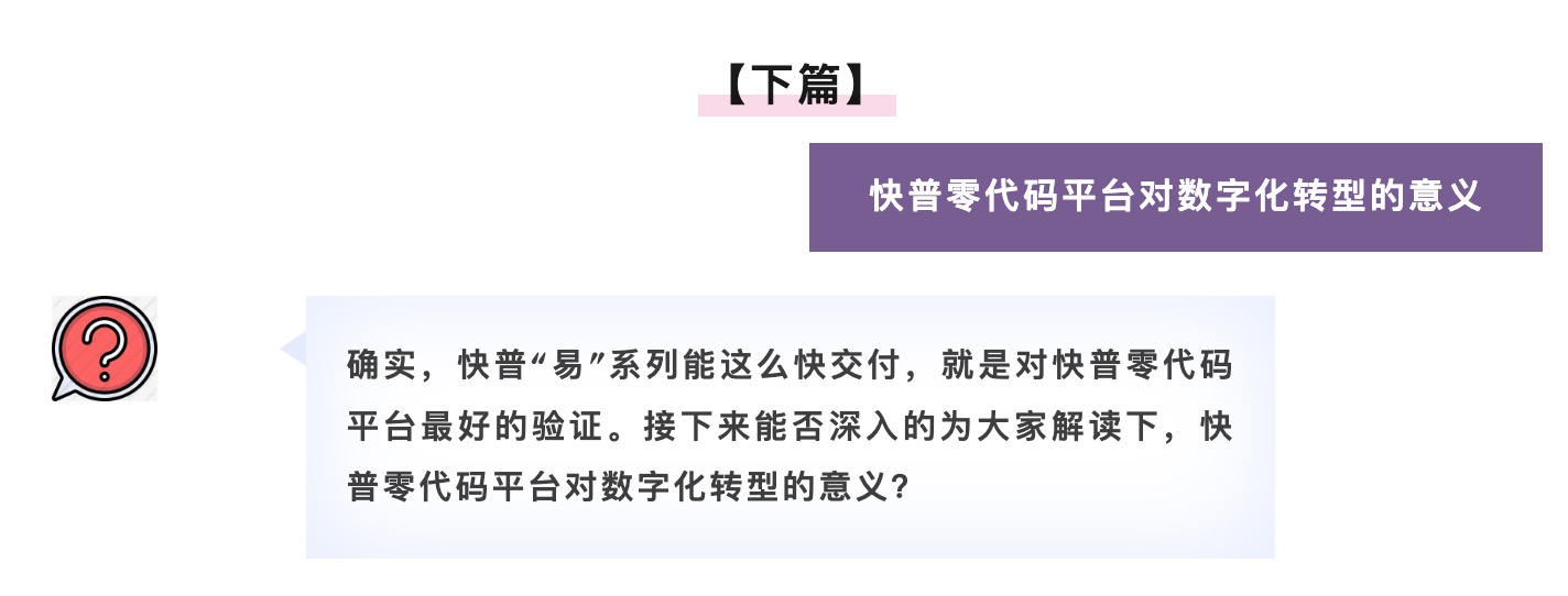是的,我們可以很自信地說“快普零代碼平臺讓數(shù)字化轉(zhuǎn)型變得簡單、可行”。這個是面對數(shù)字化轉(zhuǎn)型的所有角色而言的,包括我們自身軟件研發(fā)、實(shí)施交付,以及合作伙伴、用戶等,易平臺在效率、成本、技術(shù)門檻和可擴(kuò)展性等方面來說都有著顛覆性的突破,是非常有意義和必要的基礎(chǔ)設(shè)施??偨Y(jié)說有下面幾點(diǎn):